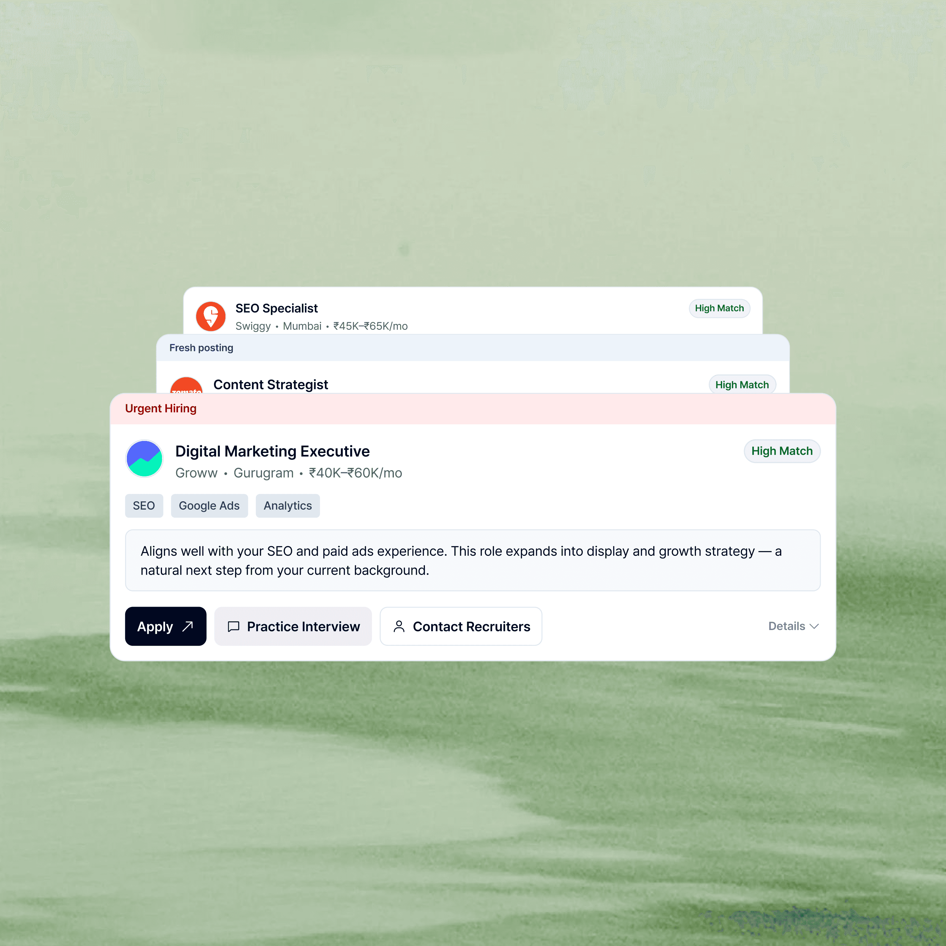 AI scans 15M+ jobs across every major platform and surfaces roles that actually fit your skills - fresher roles, internships, freelance gigs, and full-time positions.