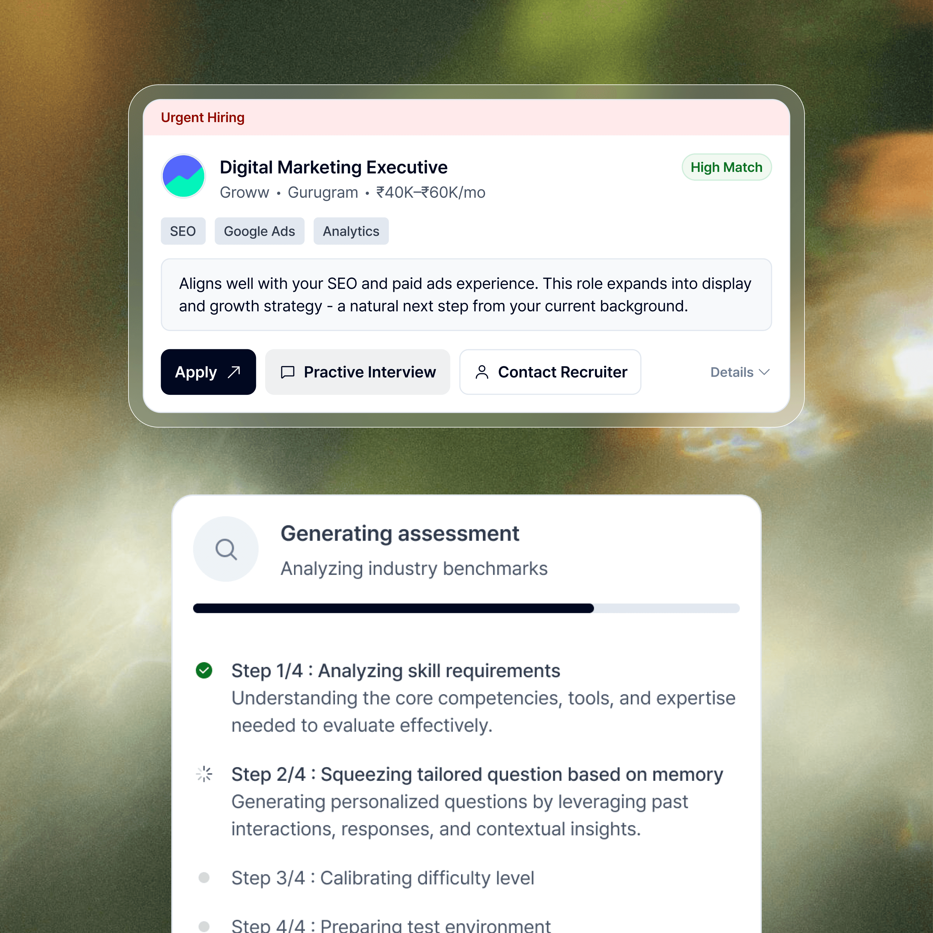 Every listing shows a % match score instantly see which roles are strong fits and which need a skills gap bridged first.
