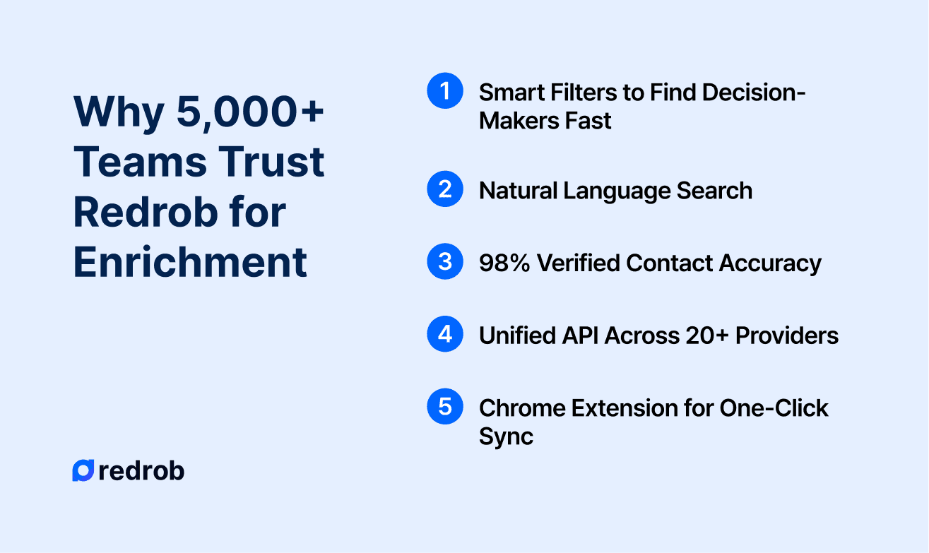 Sales leaders come to us when the outbound motion feels heavy: reps spend hours researching, tools don’t agree with each other, and pipeline looks “healthy” until it suddenly isn’t. Redrob was built to remove that friction by combining prospecting, verification, and enrichment into one workflow - so pipeline decisions are driven by current signals, not outdated records.
