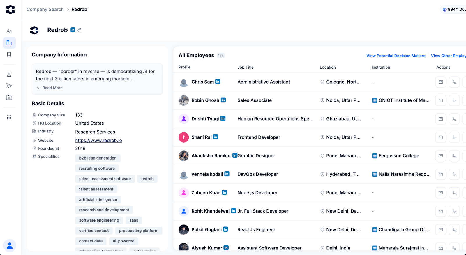 Redrob improves data reliability by combining insights from 19+ trusted data sources. Instead of relying on a single database, Redrob enriches prospect profiles using multiple sources to improve data accuracy and coverage.