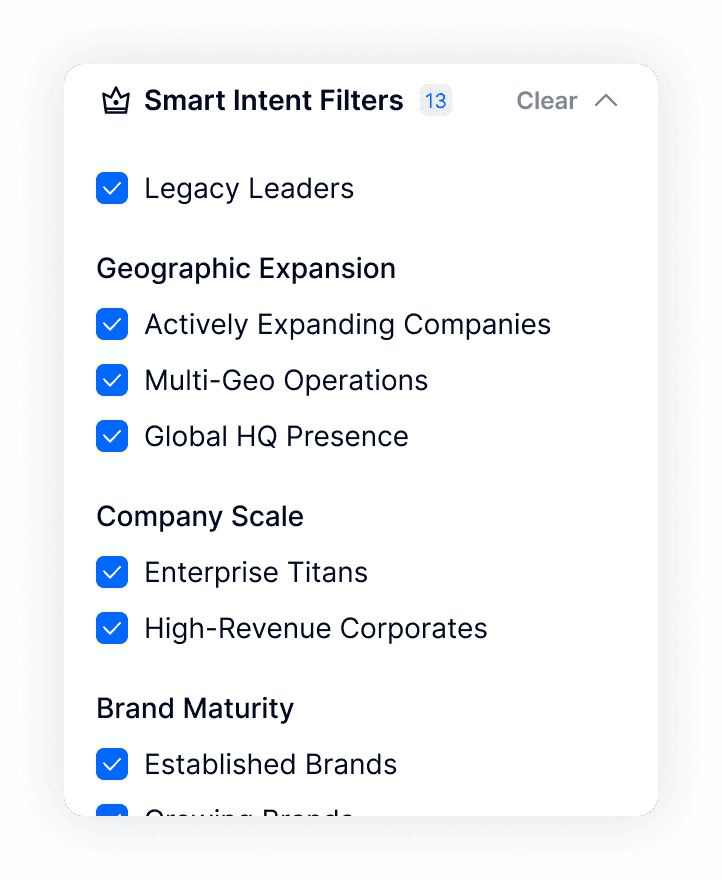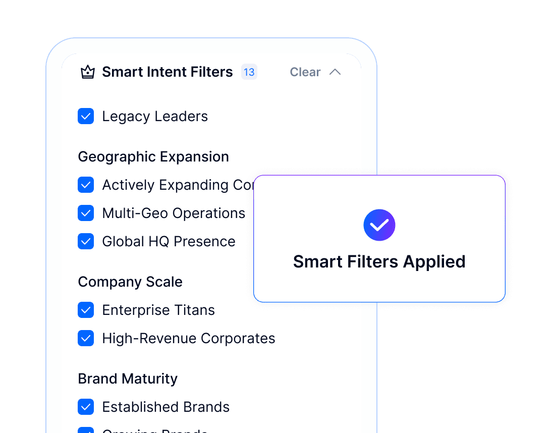 Target companies actively growing. Our Smart Filters spotlight firms with buying signals—like fresh funding, exec hiring, and global expansion.
