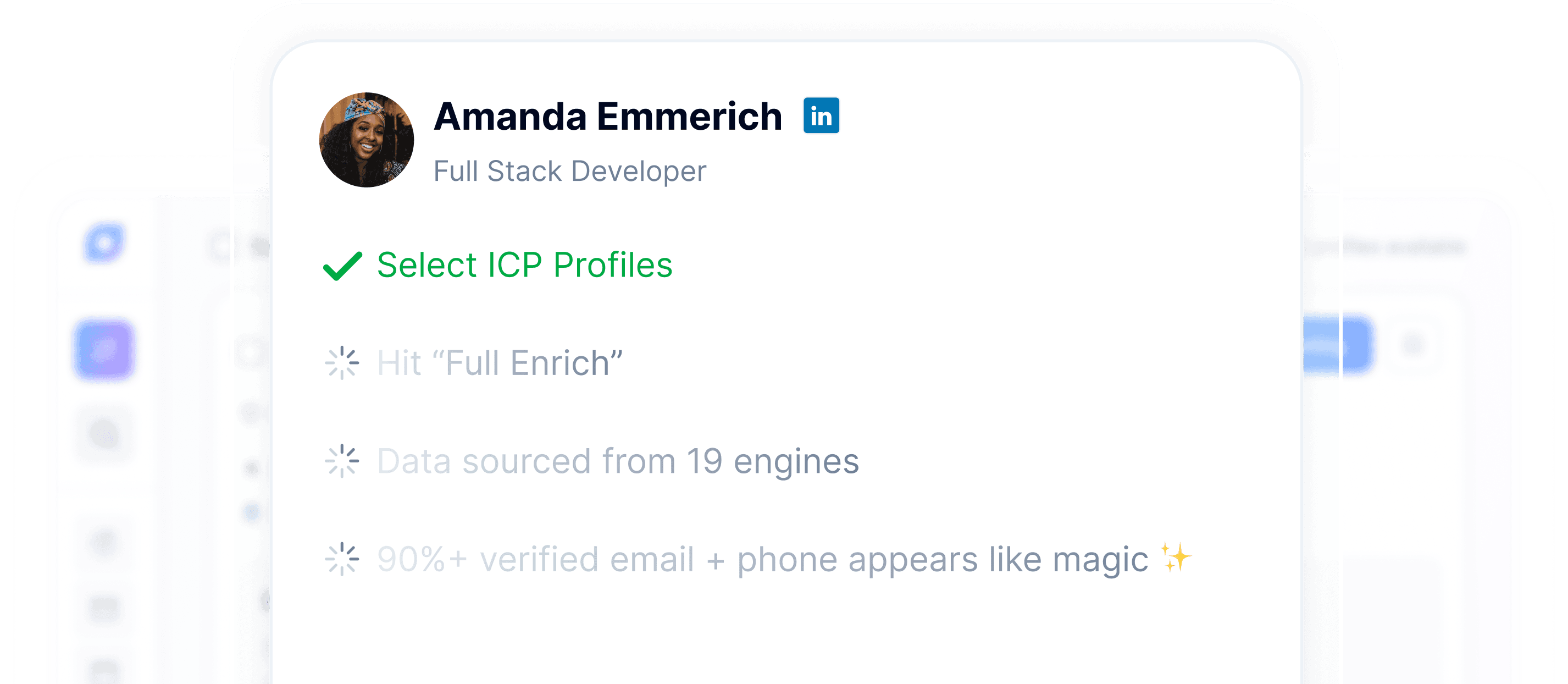 Instantly enrich leads with verified contact info, social profiles, and direct dials—sourced from 19+ trusted data providers.